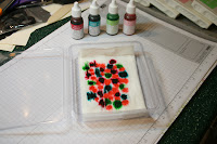 Layer four or five baby wipes in an empty container. I used an empty SU! stamp box. You could also use some type of Rubbermaid or Gladware. This will be your stamp pad. Drip your re-inkers onto the baby wipe. I start with my darkest colors to the lightest. I fill in all the empty space with lightest color.